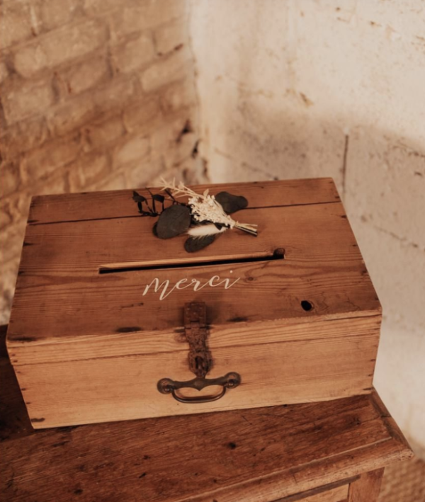 Urne de mariage en valisette bois, idéale pour récolter cartes et enveloppes avec charme et élégance.